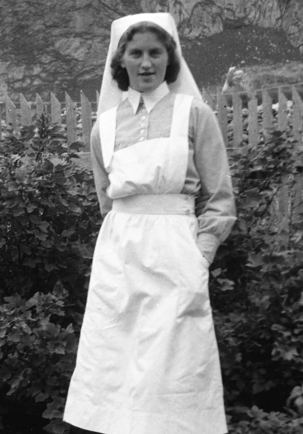 «Nelly, no må du kom, alle fær!» ropte dei til henne. Kva skulle ho gjere? Ho følte seg fanga av stemninga som hadde oppstått. Skulle ho følge med dei andre, eller skulle ho verte att på Reine? Kanskje kunne dei sette henne i land når dei passerte Værøy? tenkte ho for seg sjølv. Samtidig visste ho at dette var ein urealistisk tanke: No hadde ho teke eit val og måtte stå ved det. Ho kunne heilt sikkert vere til nytte dit ho kom, ta seg av soldatar som hadde blitt skadde i krigen eller hjelpe familiar som hadde mista nokre av sine næraste. Ho var ung og usikker. Ikkje visste ho særleg mykje om forholda i det krigsherja England heller. I all hast pakka ho sjukepleiebøkene og uniforma «i den brune kofferten» og sprang ned til sjøen. Der venta ei fiskeskøyte som hadde teke på seg å få folk over til eit stort forsyningsskip ute på vågen, den danske «Gudrun Maersk».