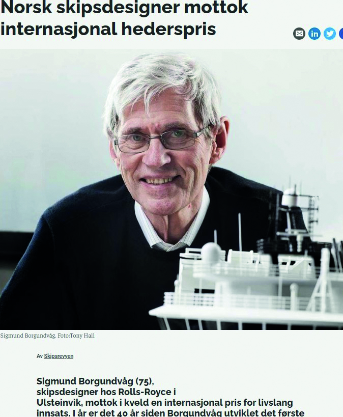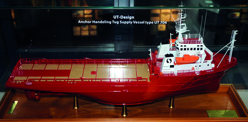 Eg møtte Sigmund heime i Ulsteinvik, og i inngangspartiet står ein modell av den fyrste UT-704 som vart bygt ved Ulstein: «Stad Sea» seinare «Far Sea». På veggen heng bevis på utmerkingar han har fått for skipsdesign han har hatt ansvar for. Der heng også eit bilde av hans møte med kongeparet, som også fekk seg ein skuletime om moderne offshorefartøy.