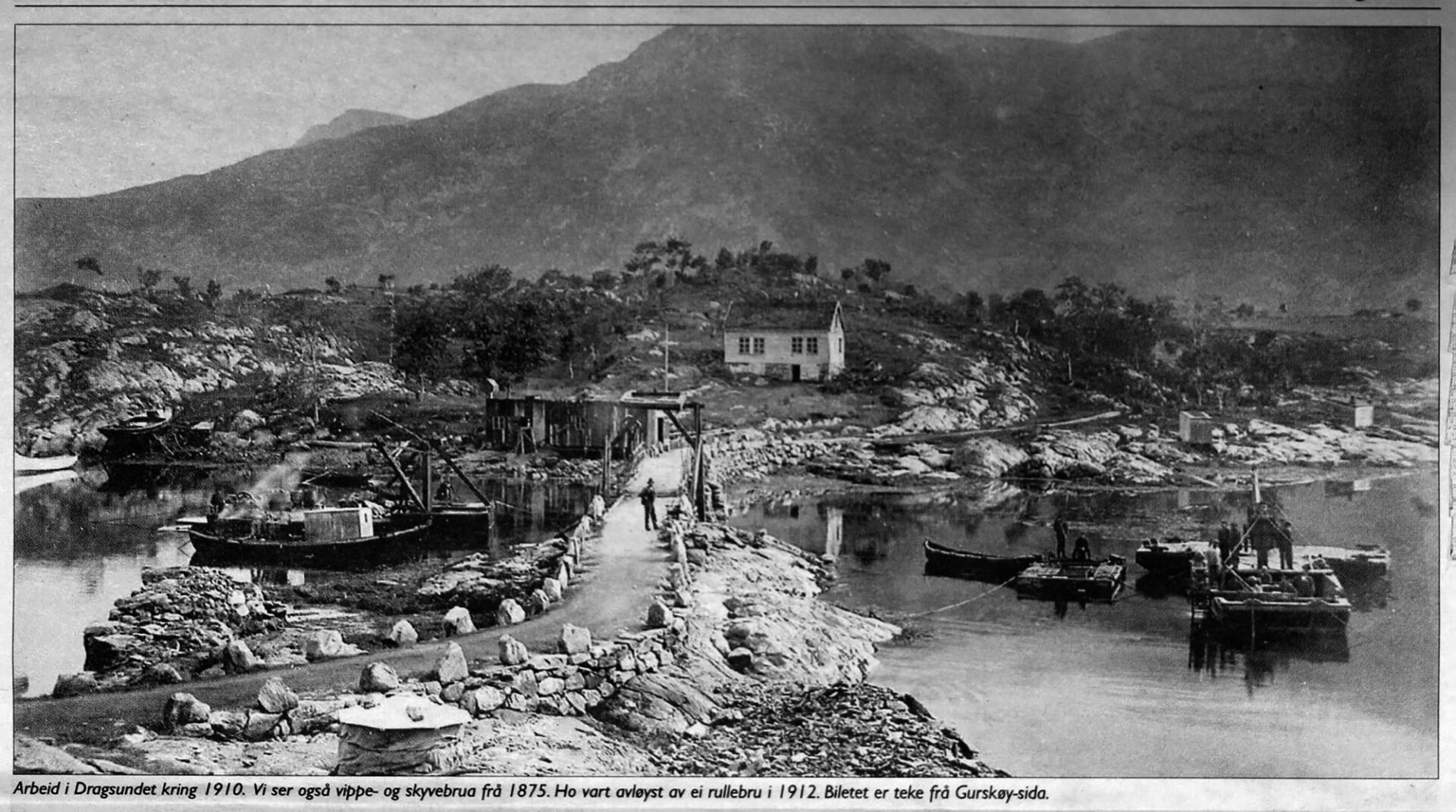 Arbeid i Dragsund kring 1910. Vi ser vippe- og skyvebrua frå 1875. Ho vart avløyst av ei rullebru i 1912.