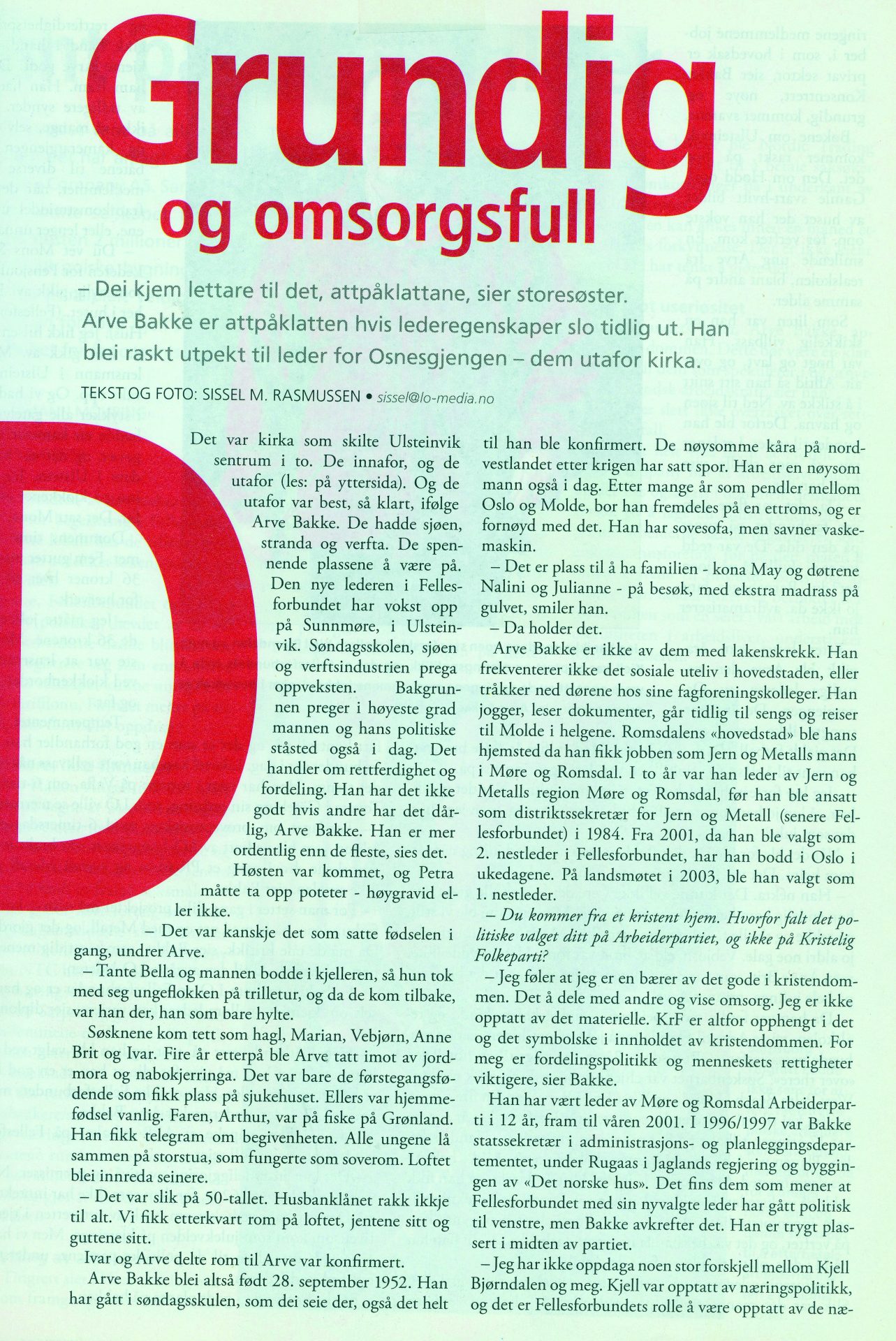 – Det å ta omsyn til andre, det med rettferdigheit. Dette fekk eg inn på søndagsskulen og ikkje minst heime. Hjalmar Holte og Oddmund Ulstein var to av lærarane me hadde på søndagsskulen. Det å høyre foreldra mine fortelje om korleis det var før, då dei vaks opp og ikkje hadde mykje å rutte med. At dei ikkje kunne gå vidare på skule, det gjorde inntrykk.